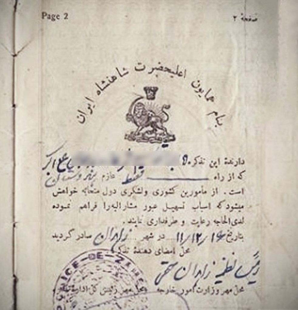 “آژنگ نیوز”: گذرنامه یا همان پاسپورت در گذشته «تَذکَره مُرور» نامگذاری شده بود. اینجا تصویری از صفحه دوم یک گذرنامه در دوران حکومت رضا شاه دیده میشود.در متن این گذرنامه نوشته شده است « دارنده این تذکره [نام صاحب گذرنامه] که از راه [نام کشورهای محل توقف] عازم [کشور مقصد] است.»