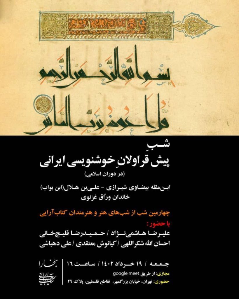 در این نشست که با حضور و خوشآمدگویی مدیران مجله بخارا و موسسه کتابآرایی ایرانی آغاز خواهد شد، دکتر حمیدرضا قلیچخانی و دکتر احسانالله شکر اللهی به نقش ابن مقله در خوشنویسی ایرانی و اسلامی و تحولات خوشنویسی صدر اسلام خواهند پرداخت. استاد علیرضا هاشمینژاد در مورد ابن بواب صحبت خواهند کرد و استاد کیانوش معتقدی نیز تأثیرگذاری و آثار خاندان وراق غزنوی را مورد بررسی قرار خواهند داد.