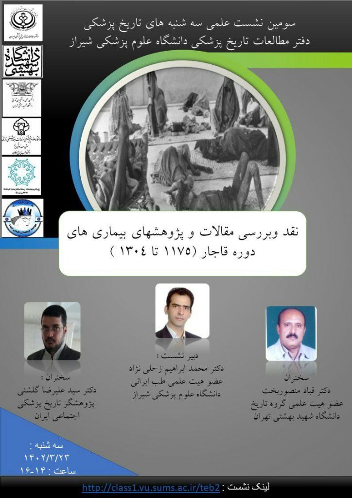 با ارائه مقاله:نقد و بررسی مقالات و پژوهشهای بیماری های دوره قاجار (۱۱۷۵ تا ۱۳۰۴)