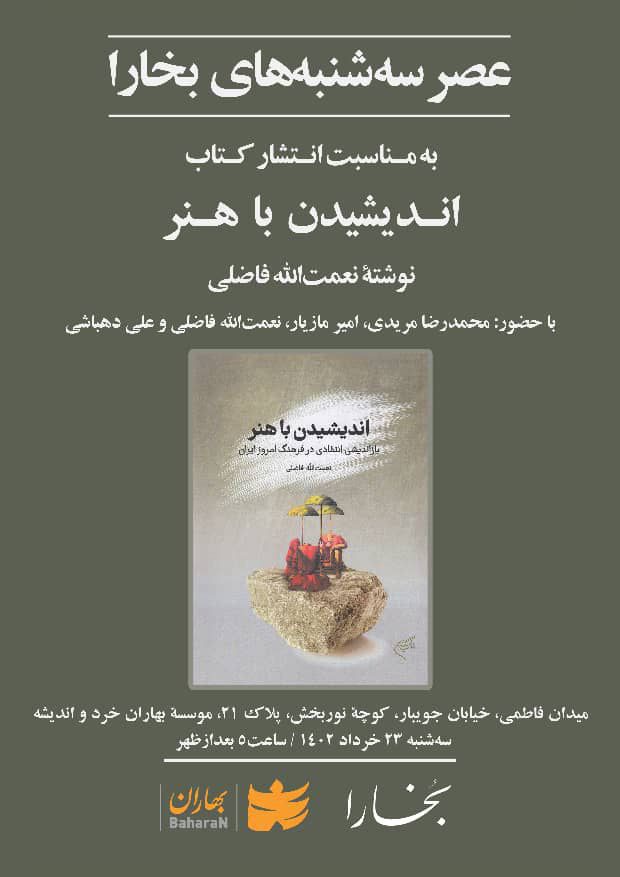 به مناسبت انتشار کتاب «اندیشیدن با هنر» نوشتۀ دکتر نعمتالله فاضلی که از سوی مؤسسۀ متن و فرهنگستان هنر منتشر شده است، دهمین نشست عصر سهشنبههای مجلۀ بخارا به بررسی این کتاب اختصاص یافته است. این نشست در ساعت پنج بعدازظهر سهشنبه بیست و سوم خردادماه ۱۴۰۲ در مؤسسۀ بهاران خرد و اندیشه برگزار میشود.