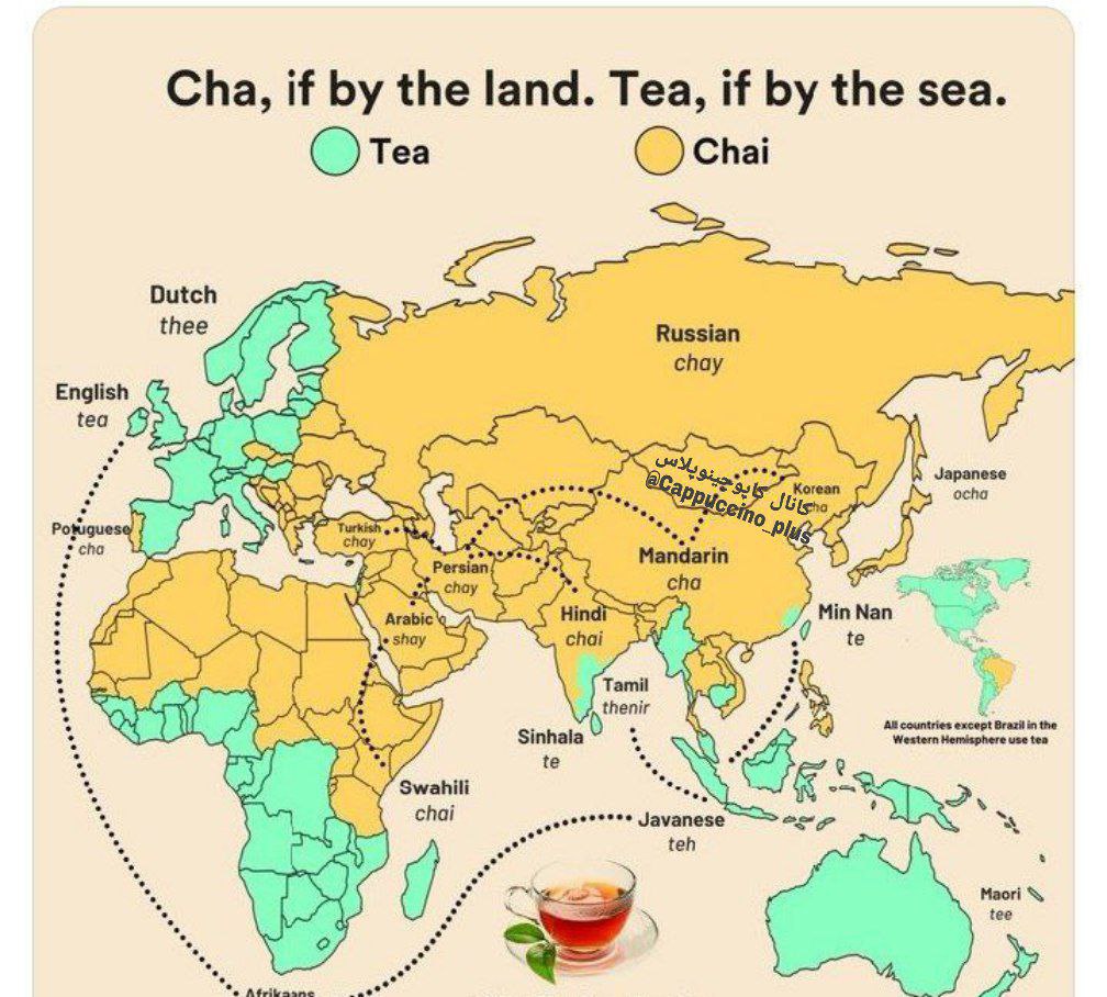 دلیل این موضوع هم آن است که به این گیاه در داخل چین “cha” میگویند اما دربنادر Dutch تایوان و Fuijan بوده که به چای “te” میگفتند. لذا هرجا که این محصول از طریق دریایی رفته به آن نام تی داده اند.
