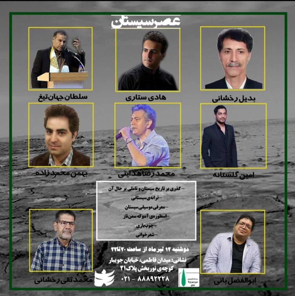 “آژنگ نیوز”:نشست”عصری با سیستان” برگزار می شود.اکنون و در زمانهی تیرگیها و خستگیها که بر پیکر ایران عزیز و خاصه به سرزمین نیمروزسیستان دیرپای میرود بر آنیم تا مهربانی مردم خوب سیستان را به پایتخت بیاوریم و در برنامهیی با عنوان “عصری با سیستان”