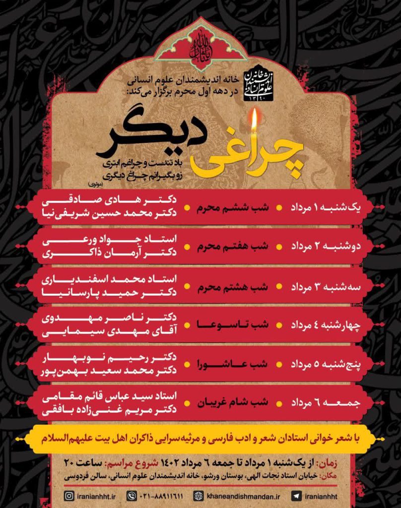 “آژنگ نیوز”:نشستهای “چراغی دیگر؛ ویژه برنامه ماه محرم” در خانه اندیشمندان علوم انسانی برگزار می شود