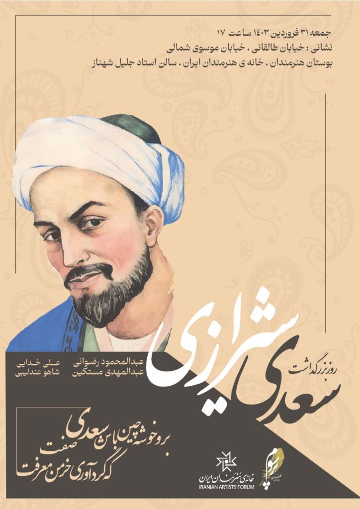 به مدد یزدان ، روز جمعه ، ۳۱ فرودین ماه ۱۴۰۳ ، ساعت ۱۷ پسین گاه در خانه هنرمندان ایران , بزم باشکوه نکوداشت شیخ اجل سعدی برگزار می شود .