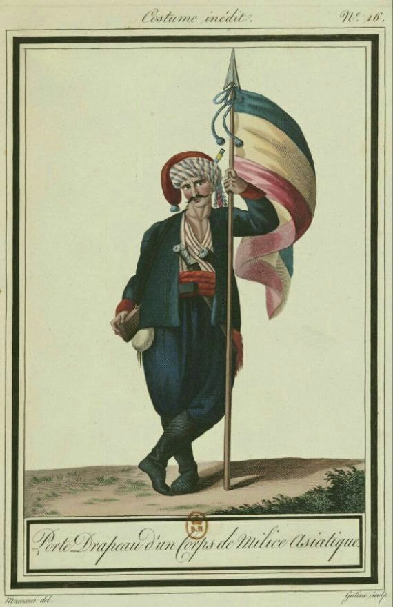 “آژنگ نیوز”:سرباز ایرانی با پرچم سه رنگ کشورمان ایران در یک نقاشی متعلق به سده هجدهم میلادی از مجموعه ای متعلق به کتابخانه ملی فرانسه در این صفحه دیده می شود.