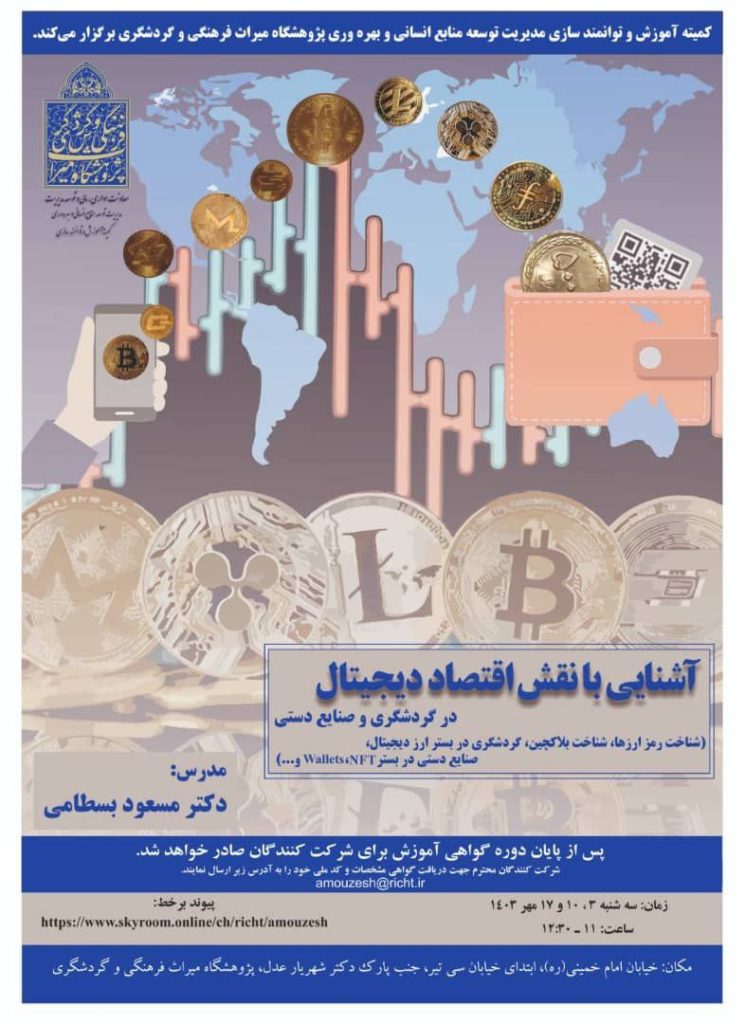 “آژنگ نیوز”: دوره آموزشی آشنایی با نقش اقتصاد دیجیتال در گردشگری و صنایعدستی از سوی کمیته آموزش و توانمندسازی مدیریت توسعه منابع انسانی و بهرهوری پژوهشگاه میراث فرهنگی و گردشگری برگزار میشود.