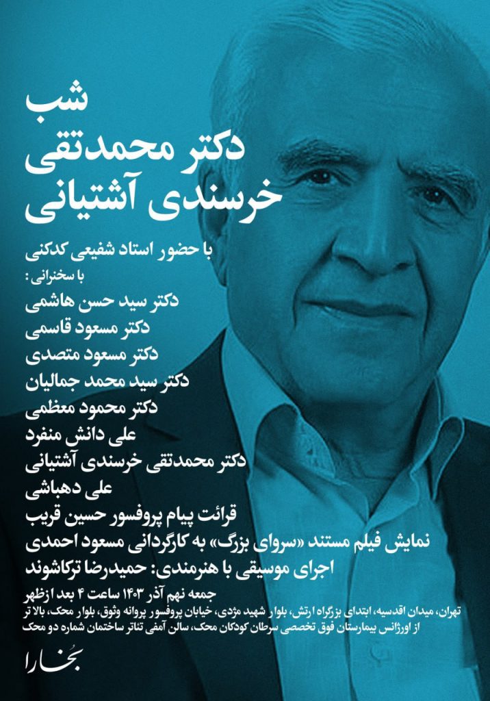 به پاسداشت یک عمر تلاش و فعالیت علمی و تخصصی دکتر محمدتقی خرسندی آشتیانی، هفتصد و هشتاد و هفتمین شب از شبهای بخارا به تجلیل از مقام علمی ایشان اختصاص یافته است. این نشست در ساعت چهار بعد از ظهر جمعه نهم آذرماه ۱۴۰۳ با حضور استاد شفیعی کدکنی و سخنرانی آقایان: دکتر حسن هاشمی، دکتر مسعود قاسمی، دکتر مسعود متصدی، دکتر سید محمد جمالیان، دکتر محمود معظمی، علی دانش منفرد و علی دهباشی در سالن آمفیتئاتر ساختمان شماره دو محک برگزار میشود. در خاتمه، دکتر محمدتقی خرسندی سخنرانی خود را ارایه خواهند کرد.