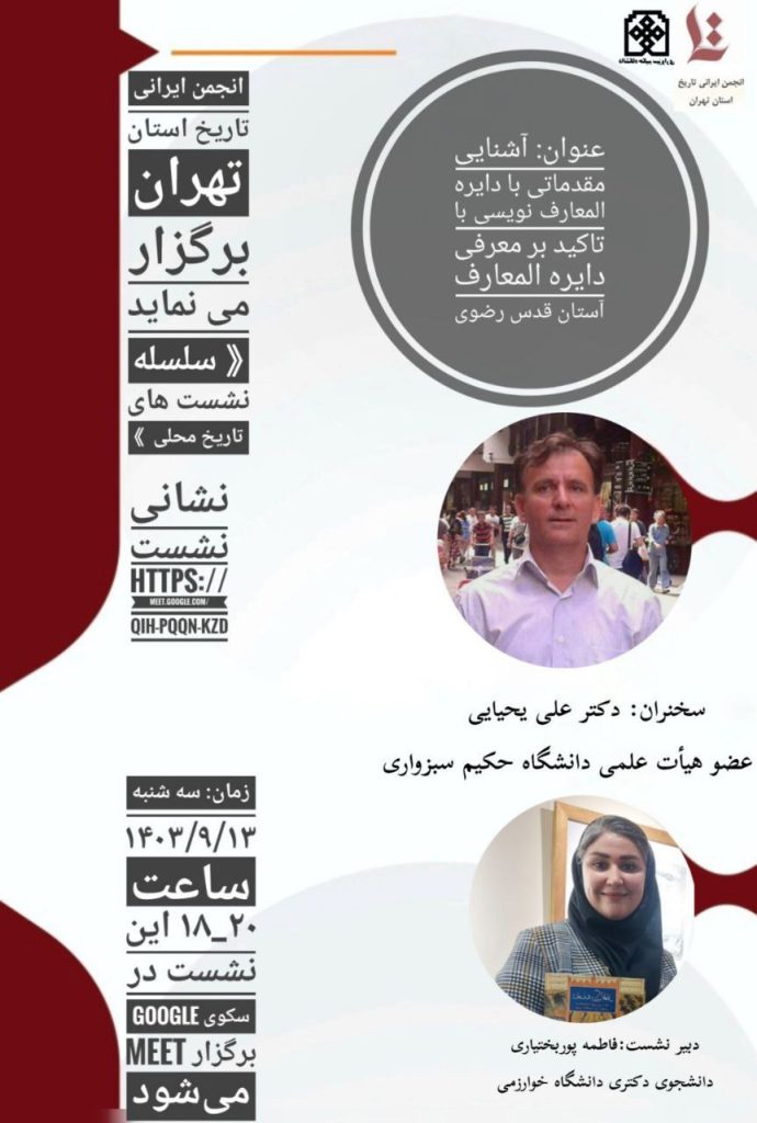 “آژنگ نیوز”: نشست آشنایی مقدماتی با دایره المعارف نویسی با تاکید بر معرفی دایره المعارف آستان قدس رضوی برگزار می شود.