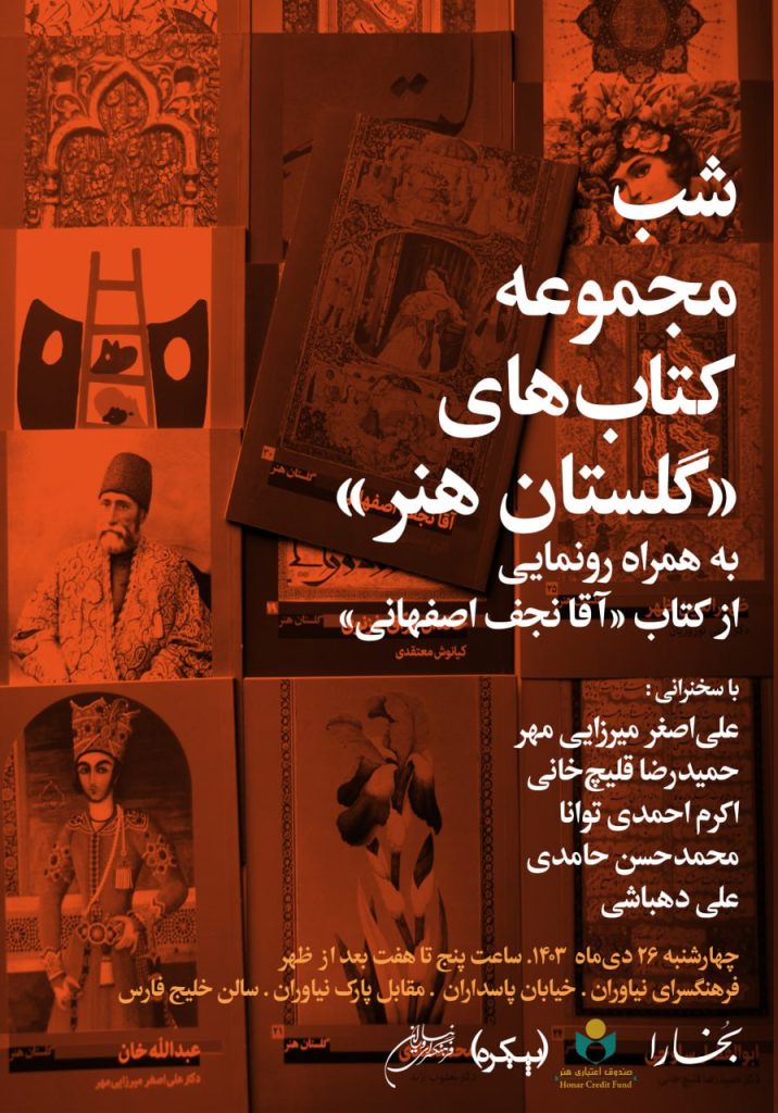 همزمان با رونمایی از سیامین جلد از مجموعه کتابهای «گلستان هنر» که به نقاش و قلمداننگار بزرگ عهد قاجار استاد «آقا نجف اصفهانی» اختصاص دارد، مجلۀ بخارا با همکاری نشر پیکره، هشتصد و چهارمین شب از سلسله شبهای بخارا را با عنوان «شب مجموعه کتابهای گلستان هنر» برگزار میکند.