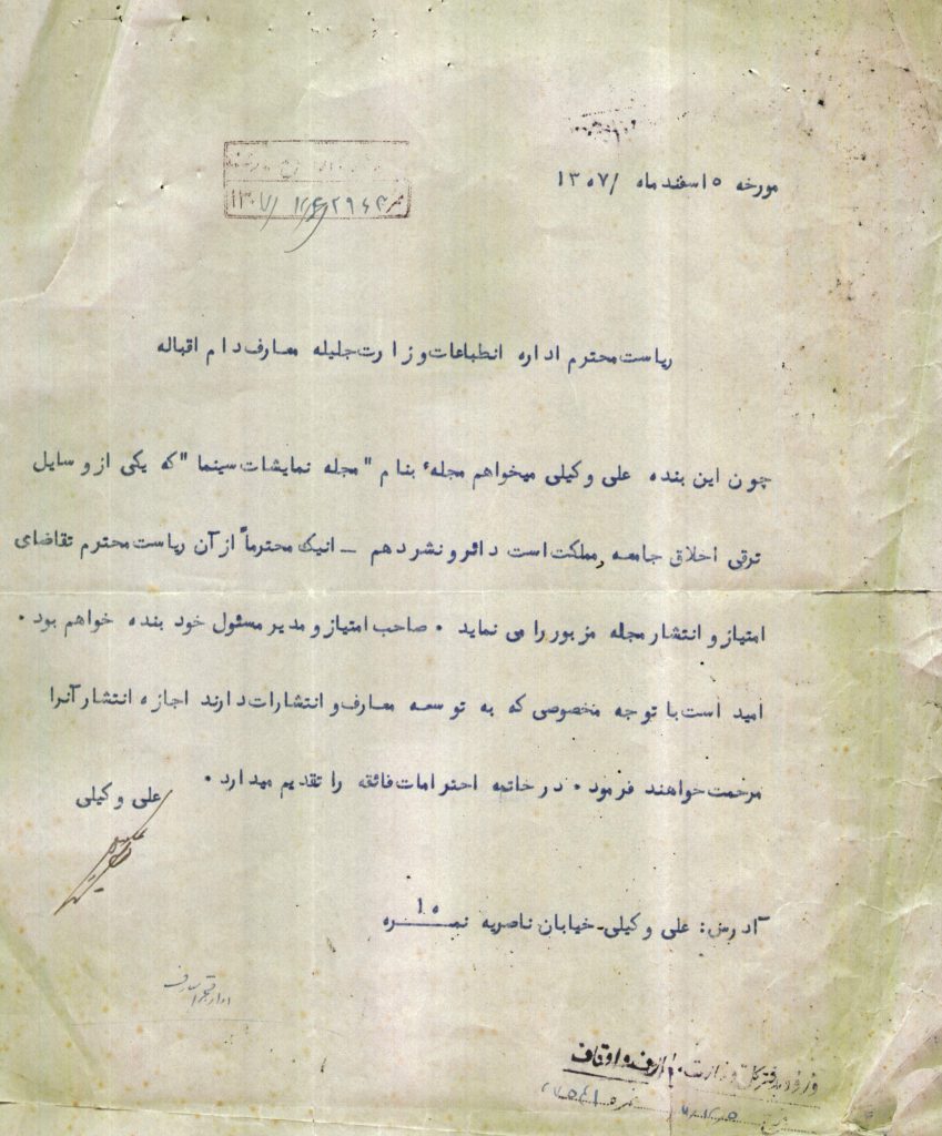 وی در ابتدا در سال ۱۳۰۷ خورشیدی برای کسب مجوز این مجله اقدام کرد. وکیلی در نامه خود به وزارت معارف چنین می نویسد: