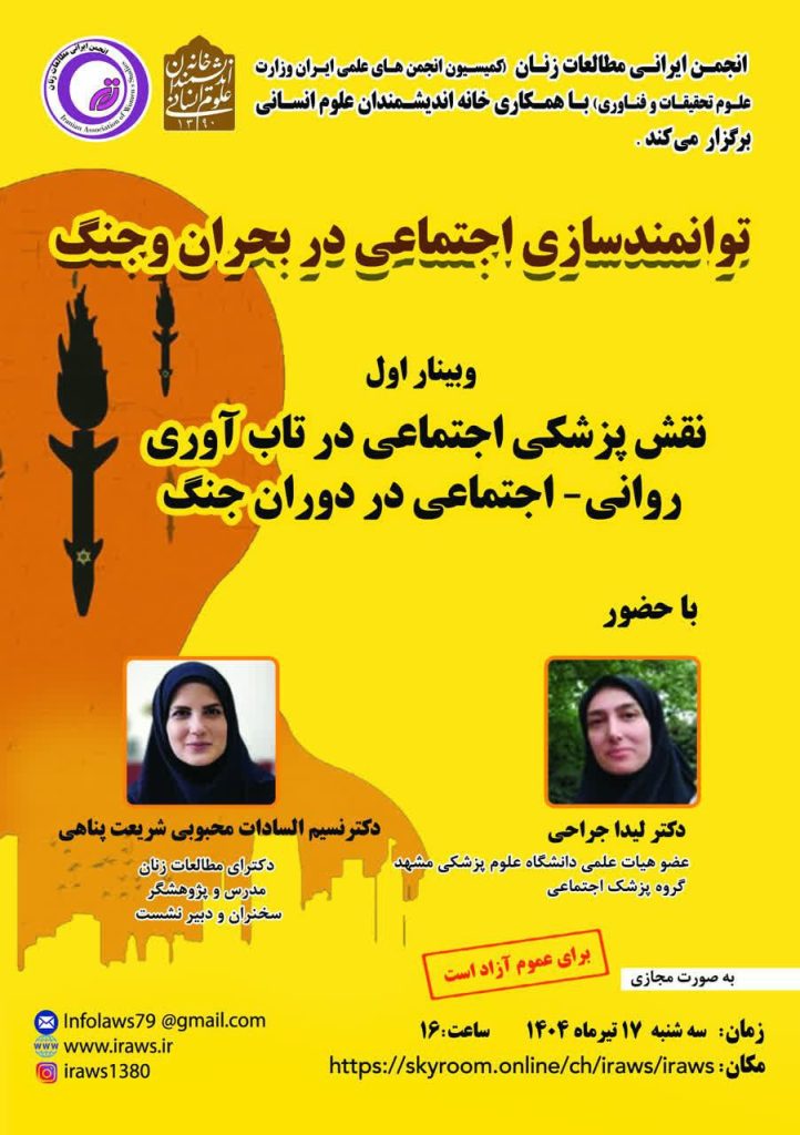 “آژنگ نیوز”: نشست نقش پزشکی اجتماعی در تاب آوری روانی – اجتماعی در دوران جنگ از سلسله نشستهای ” توانمندسازی اجتماعی در بحران و جنگ” برگزار می شود.