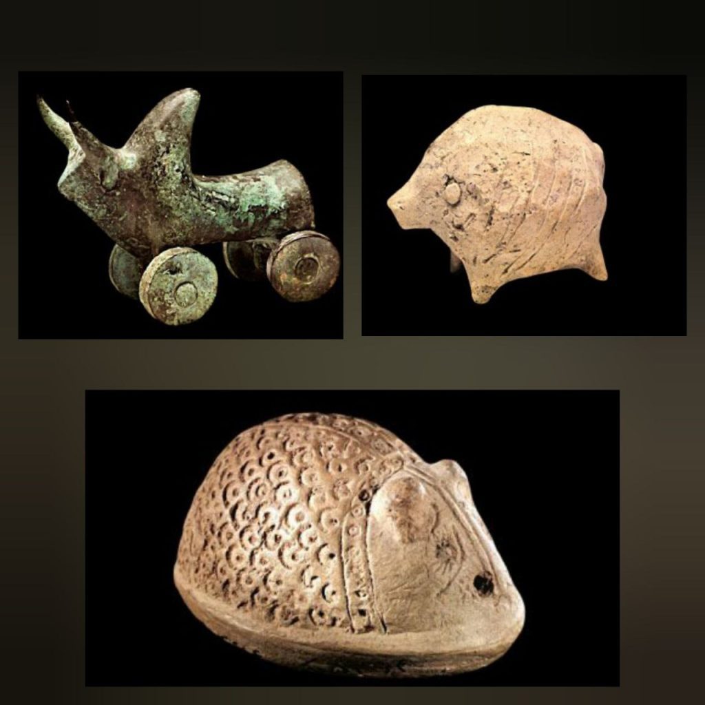 وجود تشابهاتی که بین اسباببازیهای کودکان امروزی با پیکرکهای حیوانات ساخته شده از سفال و فلز با چهار چرخ جهت حرکت که از هزارهی اول پیش از میلاد بهجا مانده، ما را وا میدارد تا آنها را در میان وسایل بازی قرار دهیم.