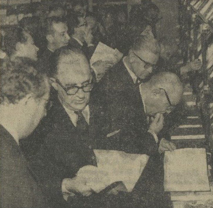 حاضران در تصویر: دکتر صالح رئیس دانشگاه ،مهندس سیحون رئیس دانشکده هنرهای زیبا، دکتر فرشادرئیس دانشکده علوم مشغول تماشای کتابها نمایشگاه میباشند.