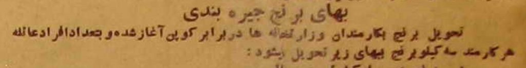 در این اطلاعیه در سال ۱۳۲۲خورشیدی آمده بود:بنگاههای ملی و کارخانه ها و مؤسسات نیز به تعداد افراد عائله هر کارمند برنج تحویل داده خواهد شد و بایستی اولیای اموربنگاهها و کارخانه ها درخواست های خود را تحویل نمایند .